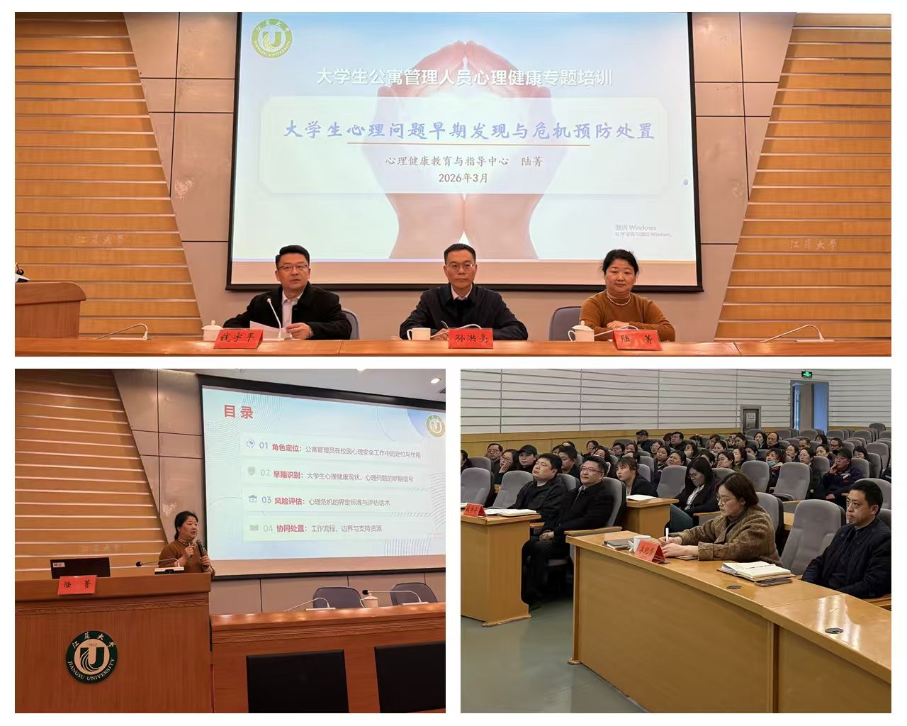 为进一步提升公寓管理服务人员的心理危机识别与干预能力,筑牢学生社区心理安全防线,3月30日下午,公寓服务中心特邀江苏大学心理健康教育与指导中心心理咨询与指导科科长陆菁副教授开展心理健康教育专题培训。后勤党委副书记、纪委书记孙洪亮出席活动,公寓服务中心全体管理员以及员工代表100余人参加培训,此次培训由中心党支部书记、主任钱宇平主持。
